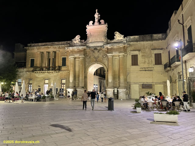 Basilica of Santa Croce, completed in 1695. A richly decorated limestone façade, including a large rose window, plus humorous and grotesque figures. Stunning in the evening sun and when lit up at night.