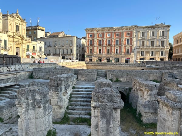 The Roman amphitheater built between the first and second centuries AD for 25'000 spectators, only rediscovered in the 20th century, on imposing Piazza Sant'Oronzo.