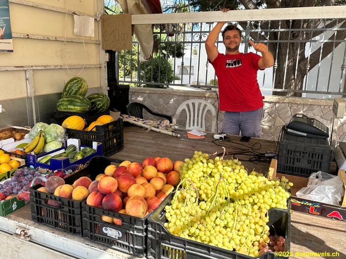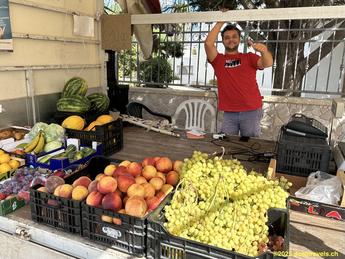 A friendly fruit vendor in Torre Lapillo on a late afternoon, after most of the produce had already been sold.