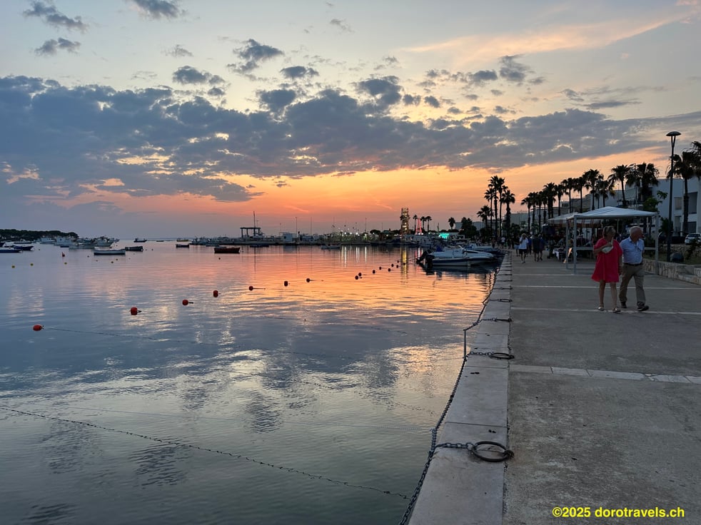 Do the evening passeggiata along the fishing boats during sunset in the harbor of Porto Cesareo